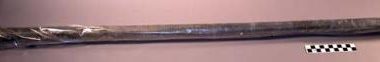 Zarabatana. Fabricado em madeira, encadernado em espiral e revestido com borracha de cor preta. O bocal tubular é feito de osso, há uma mira feita de um dente colocado na lateral do tubo, este é de cor vermelha.