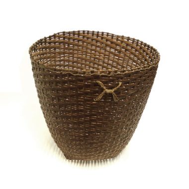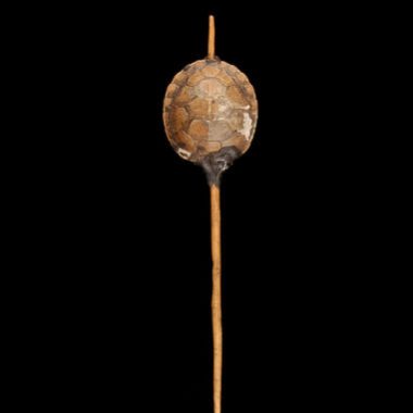 Chocalho feito de uma cabaça em forma de ovo com tinta preta (anéis). Um bastão é passado pelo corpo da cabaça, escalfado em ambos os buracos. O cabo é coberto com uma trança de palha bege e marrom formando uma decoração, uma ligadura de casca de árvore. Do alto da cabaça penduram várias plumas multicoloridas.