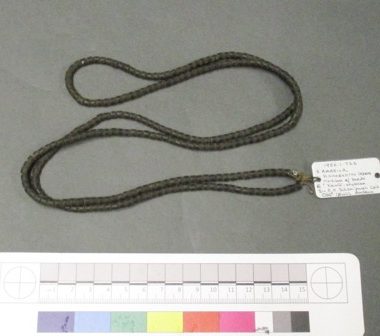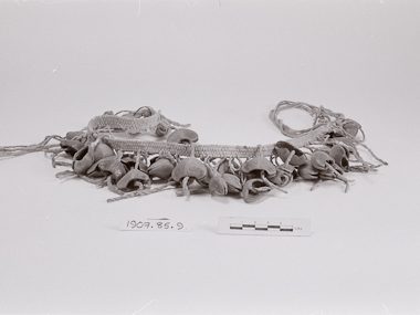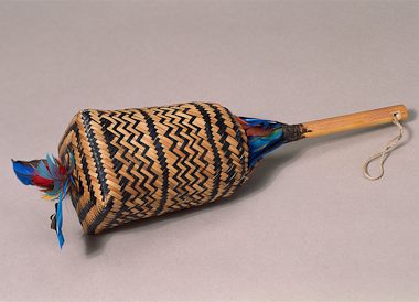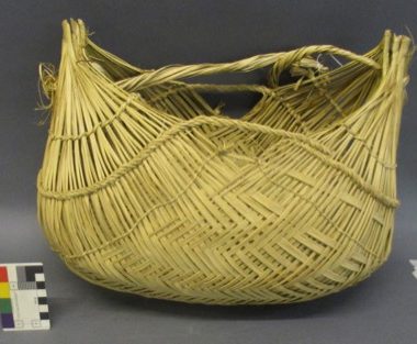 Bolsa de cestaria feita de folha de palmeira. Com três bandas de fibra vegetal entrançada correndo ao longo dos lados. Uma alça entrançada no centro. No final a bolsa termina em um ponto onde a folha de palmeira encontra o caule.