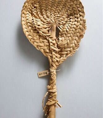 Abanador feito com trançado de longos folíolos de uma palma e preso à nervura central que forma o cabo.