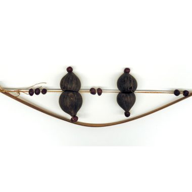 Feito de algodão gottamo, tecido em tiras paralelas brancas e brancas alternadas com tiras vermelhas verticais. Franjas de lewekra torcidas e atadas. Corante vermelho ic’agoni de origem comercial. Altura 12 cm. Comprimento 2 cm 32 (sem franjas)
