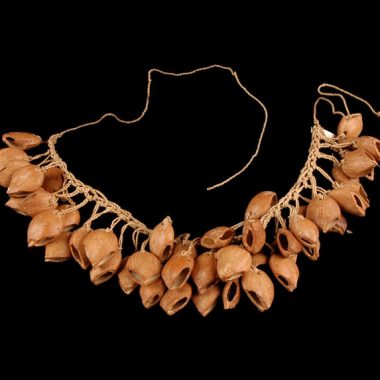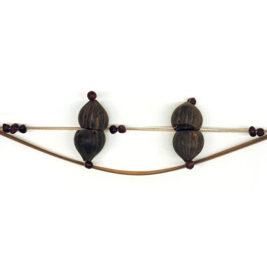 Restos de nozes quebradas (ganchos restantes), fio principal único (frágil), traços verdes em algumas nozes (pigmentos?), 1 noz quebrada em 2