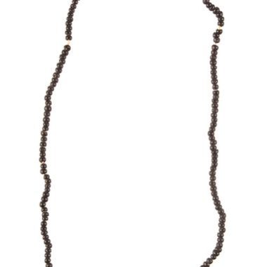 Coifa constituída por uma touca e um cobre nuca. A touca é feita de uma capa de tecido de algodão espesso e amarelado que parece ter sido cortado em crochê. Toda a superfície externa é coberta com tufos de pequenas penas montadas em conjuntos de duas, presas a ambas as extremidades de um fio costurado …
