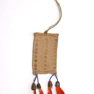 Pequeno retângulo de fibras trançadas de buriti com cordão de suspensão. Peça confeccionada por pais e usada por meninos durante a festa do milho