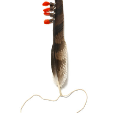 Pena comprida de águia, branca e preta, recebendo 6 pequenos pingentes (noz de tucum e pena vermelha) presos à nervura, e fuste provido de cordão de algodão (cordão de suspensão). Peça confeccionada e usada por meninos durante as festividades. Usada também pelos meninos (sem privilégio) durante a festa do milho. Segundo Andreas Schlothauer (07.10.2015): a …