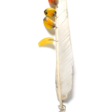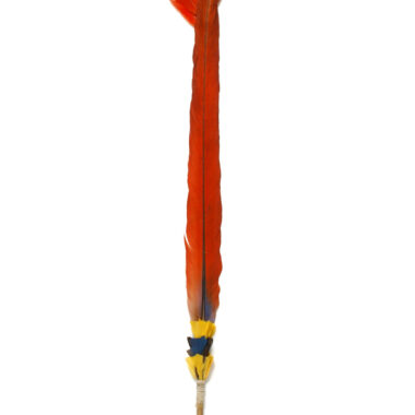 Pena de arara vermelha grande e pequenas penas de arara amarela e azul montadas em um mastro de madeira com um cordão de suspensão. Peça confeccionada e usada por homens (ou meninos) que têm o privilégio (privilégio ligado ao tipo de pena e tipo de pingente). Nota A.Vuille 21.06.2016: informações retiradas do campo vernáculo termo: …