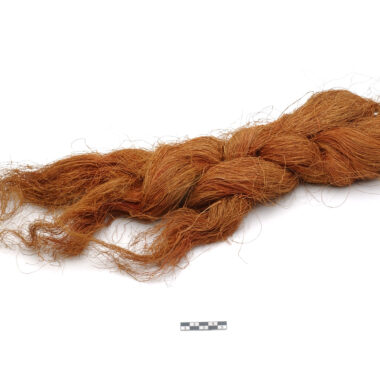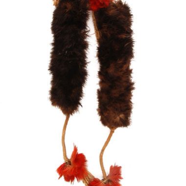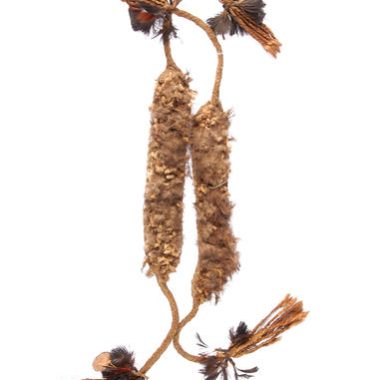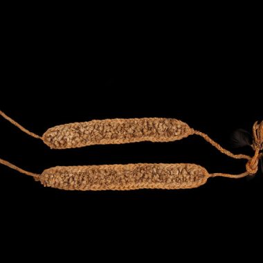 Par. Cada cinta-liga consiste em uma tira de tecido de algodão espesso e amarelado com a aparência de um tecido de crochê, 18 cm de comprimento e 2 cm de largura. A parte externa da tira é coberta com tufos de marrom e preto para baixo, montados em uma série de dois, presos em ambas …