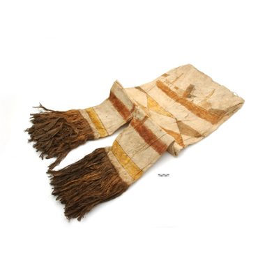 Calças de vestimenta de entrecasca batida e pintada. Franjas nas extremidade das pernas das calças.