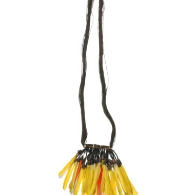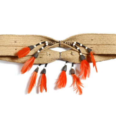 Enfeite de penas para meninas das Antilha, segundo registro. Nota L. Velarde 2003: Muito semelhante aos conjuntos Mundurucu. Nota: População: Mundurucu? Da carta do Dr. Andreas Schlothauer, este objeto é uma peça típica da População Mundurucu, acrescenta ainda que seria uma faixa toráxica (Oberkörper-Bänder). Segundo Andreas Schlothauer (07.10.2015): é sim uma cinta de ombro