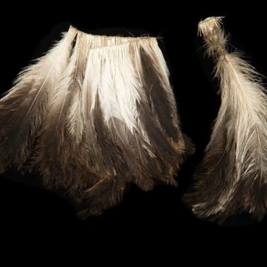 Bastão constituído por um cabo de junco de 17 cm de altura; uma armação de junco de 2 cm de diâmetro e 25,5 cm de altura coberta com penas entrelaçadas na armação e com as hastes fixadas com fio de algodão. A primeira fileira de penas, de 1 cm de altura, consiste de penas pretas …