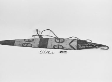 Vestimenta de entrecasca. A seção superior é cônica pintada com desenhos geométricos em preto e amarelo, a borda inferior é franjada com fibra vegetal. Existem duas mangas cônicas.
