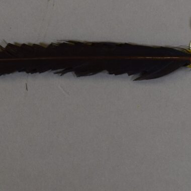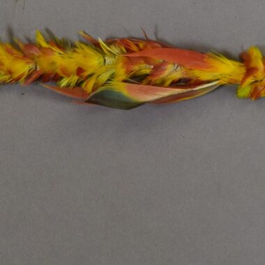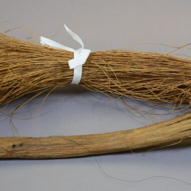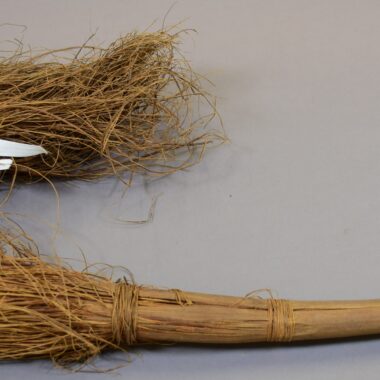 O cabo (metade inferior da peça) é revestido com um entrançado de fibras de palmeira (claras) e fibras de ambé (escuras) e termina lateralmente com 2 pendentes em franja. Ver arquivo 40785 (Informações sobre o acervo). Jogos, brinquedos e danças. Artigo para uso por crianças. Possivelmente utilizado por homens durante discursos cerimoniais Segundo Gustaaf Verswijver …