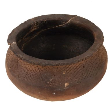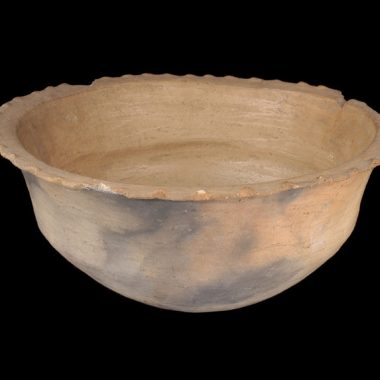 Em cerâmica bege. A) Pequena base plana, corpo troncocónico invertido, com carena central. No pescoço, uma pequena área horizontal achatada, recortada com marcas de dedos. Superfícies alisadas. Altura: 13 cm, diam. da base: 8 cm, diam. máximo: 27,5 cm, espessura : Terracota. Feito com uma bobina. O alisamento foi provavelmente feito durante o processo de …