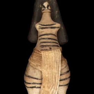 Em argila crua ocre (ude[a]) e cera preta (tabora[a][a]). Representa uma mulher esteatópica; membros superiores não representados; membros inferiores volumosos; cabelo formado por uma simples bobina de cera dobrada; face cônica; boca formada por uma fenda horizontal; umbigo oco (3mm de profundidade). Decoração preta incisada e pintada (genipa) mostrando pintura corporal e tatuagem facial. Vestígios …