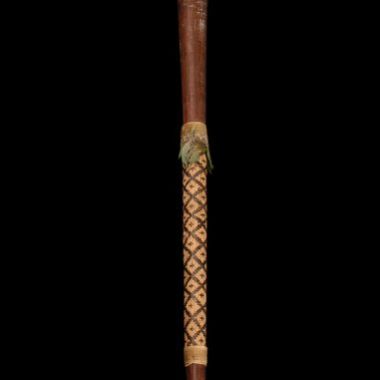 Bordunade madeira, geralmente de forma cônica, com as extremidades também cônicas. Uma parte da borduna é coberta por uma decoração de palha bege e marrom formando um padrão de quadrados, medindo 28 cm de comprimento. Em dois lados, a palha é presa à borduna com um cordão de algodão de cor natural. De um lado, …