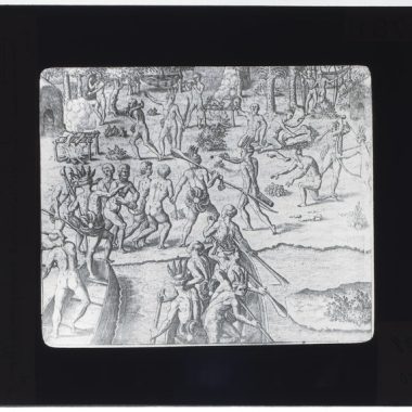 Mágicos tupinambás vestidos com mantos de penas e índios fumigadores dançando ao seu redor [gravura]