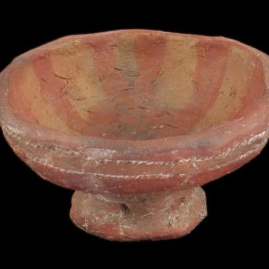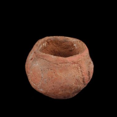 Feito de argila de Napaworo. Sob a forma de um pequeno pote redondo com pé liwege. A superfície exterior tem uma decoração em recortada feita pela impressão de um cordão noone com um revestimento de pedra branca esmagada em água apakeri nos buracos.
