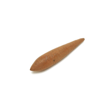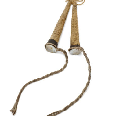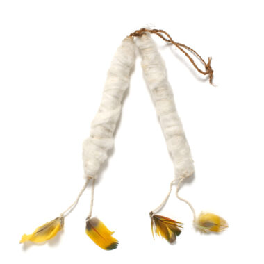 Objeto feito de fibras vegetais envolto em fio de algodão cru e provido em sua frente de 2 pequenos pingentes (rosário de pérolas azuis e uma noz de tucum e uma pena vermelha), peça feita por homens e usada por meninos e homens que já tiveram seu nome bemp “confirmado”
