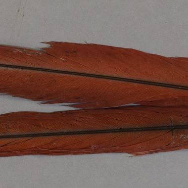Decoração occipital: pente de madeira com duas grandes pinhas de arara vermelha. Colocado no coque do cabelo, pinnae ereto na nuca.