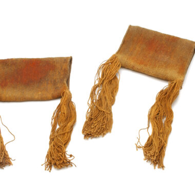 Anel grande em fio de algodão tingido com roucou, tricotado e munido de 2 pendentes de fio de algodão franjado. Está tudo tingido com roucou. Esta peça é feita por mulheres e usada por homens que têm o privilégio dela durante as festividades.