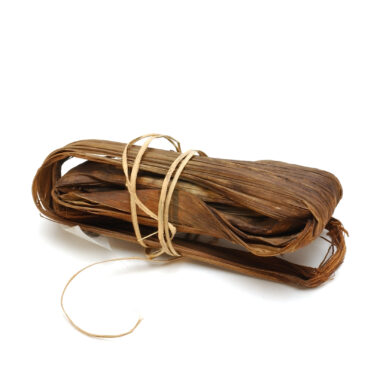 Faixa de liberdade da árvore âmbar enrolada em um caracol e presa dessa forma por meio de um laço. Trabalho do homem. Fibras Ambé são usadas para trançar flechas, em particular