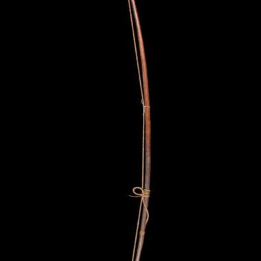 Arco com fio. Arco pesado de madeira com seu cordão torcido. Ambas as extremidades são decoradas com palha bege e preta, formando um padrão diamantado. As tranças ao redor da madeira são amarradas com uma faixa de casca de árvore. Penas multicoloridas penduradas no final de uma das tranças. Comprimento = 187,5 cm