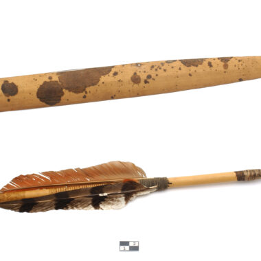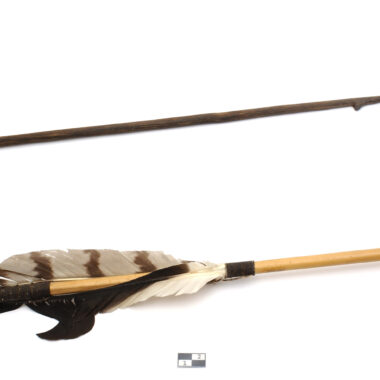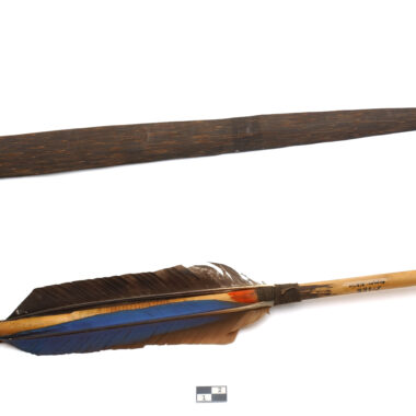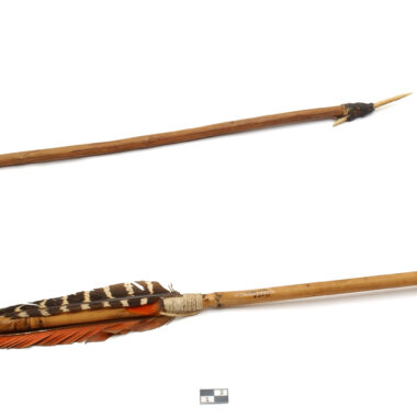 Objeto cônico de madeira, amarrado com fibras de casca em torno de parte do junco. Empennage composto por 2 penas de arara vermelha e azul cata-ventos amarradas com fio de algodão. Usa um entalhe de salto. Ponta farpada de um lado. Ver arquivo 40785 (Informações sobre o acervo). Objeto feito e usado por homens exclusivamente …