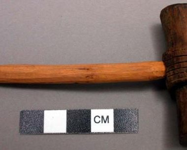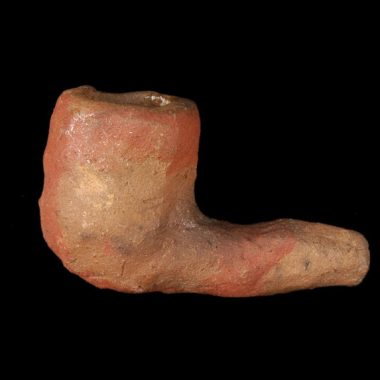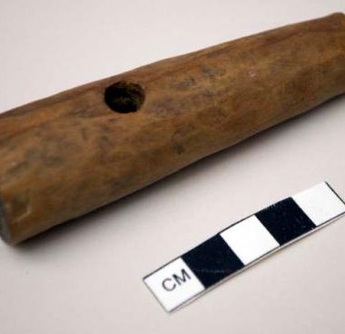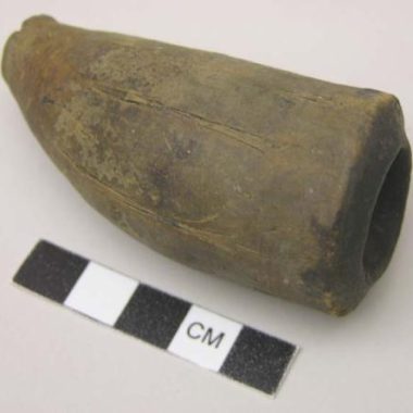 Cachimbo de madeira em forma de pera com superfície gravada com 2 linhas circulares.