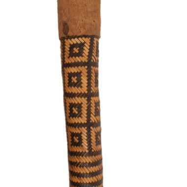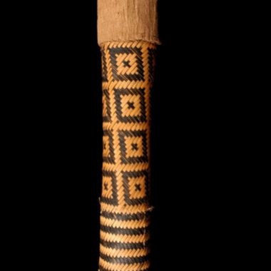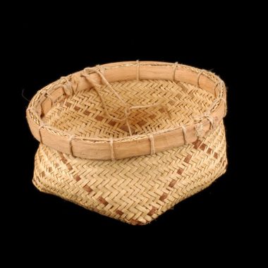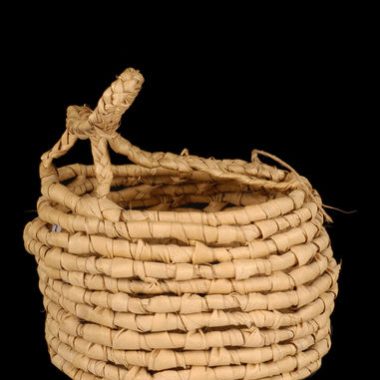 Recipiente provido de tampa entrelaçada, trançado em folhas de palmeira babaçu rontire’ô “e consolidado por uma moldura de paus de madeira. Encadernação de fio de algodão. Peça feita por homens e utilizada por ambos os sexos para guardar as peças de adorno”