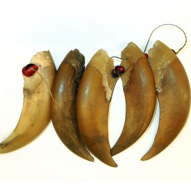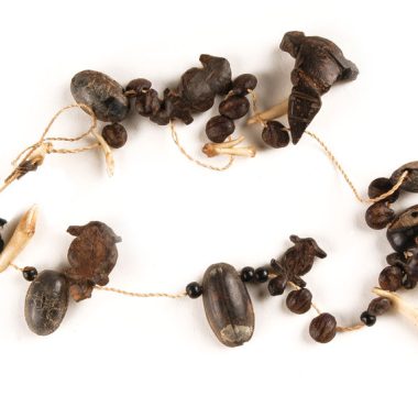 Colar composto de 5 peças zoomórficas, dentes e grãos – esféricos e ovóides -, amarrados em uma corda de chambira.