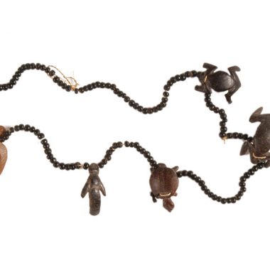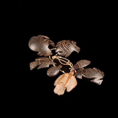Colar composto de 4 peças zoomórficas (3 pretas e 1 marrom) e uma peça antropomórfica preta. Estas 5 peças são separadas umas das outras por pequenas contas negras esféricas, amarradas em um fio de chambira.