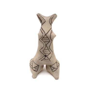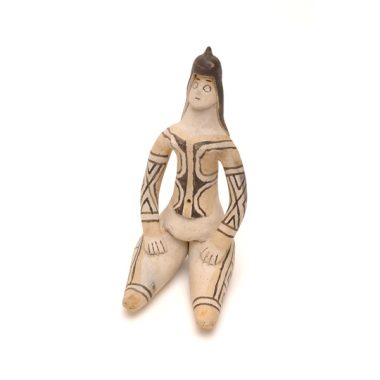 Boneca de cerâmica bege, representando uma figura feminina com postura de pé com as pernas ligeiramente afastadas , braços ao longo do corpo , quadril e nádegas volumosos , usando tanga de fibra de folha de palmeira , pulseiras , corpo adornado com pinturas corporais , cabelo abundante. Modelada e pintada em laranja, bege e …