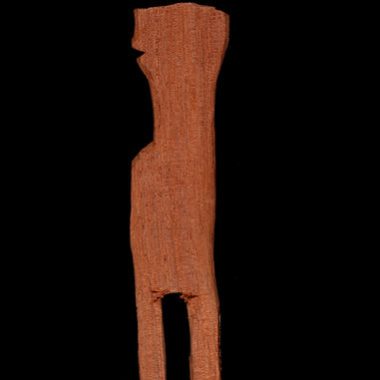 Uma placa de madeira de cedro esculpida representando um personagem sem braços. em perfil. Altura 11 cm.