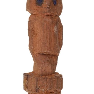 Pequena figura de pé. pernas dobradas em um banco redondo de quatro patas. Os braços são colados ao corpo e dobrados para trás. Os olhos são feitos de pequenos fragmentos de contas de vidro azul incrustadas. Altura 3 cm.