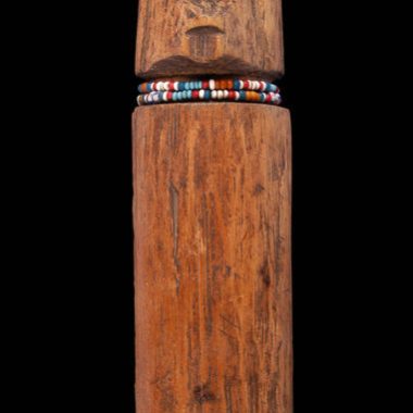 Corpo cilíndrico superado por um rosto de mulher prognata, com corte de cabelo no pescoço e dois colares policromados de contas de vidro ottikíl de origem paraguaia. Altura 16. 4 cm.
