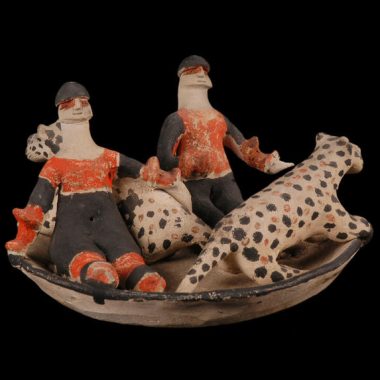 Cena representando crianças (elas não usam a trança de homens adultos) brincando com onças-pintadas e um pássaro. Eles usam pulseiras grandes, o corpo é decorado com tinta preta e ocre. Suporte na forma de um pires. Diâmetro máximo 13,5 cm; altura máxima 7,7 cm. Coletado em 1951.