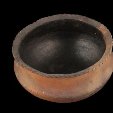 “Cerâmica com borda serrilhada, interior preto, sem tinta”. A) cerâmica. Carroceria carenada, pé chato, base lisa, largo, pescoço muito baixo, completamente everted, com interior liso decorado com incisões. Superfícies bem alisadas, interior preto brilhante. Altura: 1,5 cm,” b) argila bastante fina,| agente desengordurante de origem vegetal,| em proporção bastante elevada: fragmentos alongados de silício,| textura …