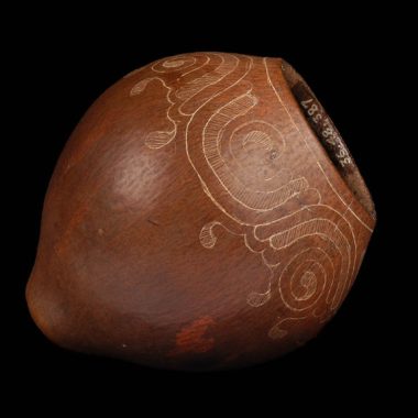 “Meia cuia com borda superior laqueada de preto dentro e fora. A cuia serve como copo para beber cerveja de: pajuaru e/ou caisuma cerveja feita a base de frutos de mandioca ou palmeira (de Vos) respectivamente. Nimuendajú, 1952: 33 menções.