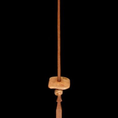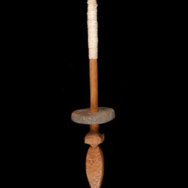 Feito de madeira viniati roíkoígo. O corpo cilíndrico do dinoedigige afunilado em direção à extremidade superior do talapettikeleme terminado com um botão esculpido ? Peso da cerâmica heiro circular. A cabeça tem duas extremidades em forma de pirâmide