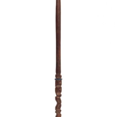 Fabricado em madeira de aruera acomaci. Corpo cilíndrico quebrado na extremidade, falta o peso. A cabeça é quadrangular em seção transversal, dividida em setores por entalhes e decorada com entalhes nos cantos e rostos. Um colar fino de contas de vidro azul ottikil