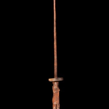 Feito de madeira viniati roíkoígo. O corpo cilíndrico do dinoedigige com um botão esculpido até a extremidade superior do talapettikeleme. Bastão com balança circular de pesagem óssea que parece ser feita de uma ficha perfurada.