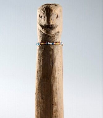 Cabeça de cabelo comprido usando um chapéu chato. A borda inferior do cabelo, o osso da sobrancelha e a bochecha são indicados por um único sulco oco. O rosto é prognático com um queixo longo e protuberante. Altura 8,5 cm.