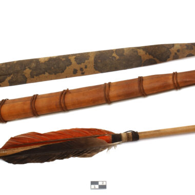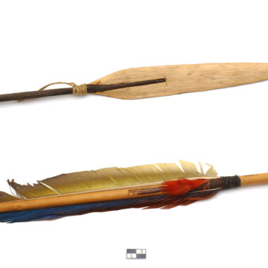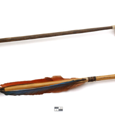 Objeto cônico de madeira, amarrado com fibras de casca em torno de parte do junco. Empennage composto por 2 penas de arara vermelha e azul cata-ventos amarradas com fio de algodão. Usa um entalhe de salto. Ver arquivo 40785 (Informações sobre o acervo). Objeto feito e usado pelos homens para a caça, excepcionalmente para a …