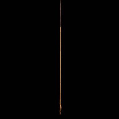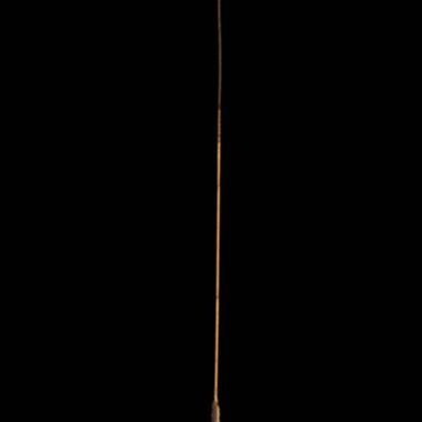 Haste de junco “Taquara”. Ponta de madeira, amarrada com casca e acabada com uma ponta de osso, fixada com um fio de algodão. Na outra ponta: ornamento composto por duas grandes penas brancas, marrons e pretas e várias pequenas vermelhas e amarelas. Os tubos são fixados com um fio de algodão, as extremidades pontiagudas das …