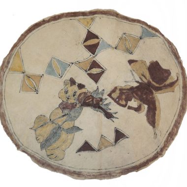 Touca de máscara com duas orelhas circulares fixadas por laços. O rosto é desenhado com pigmento preto.