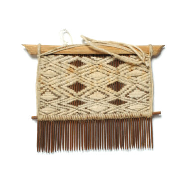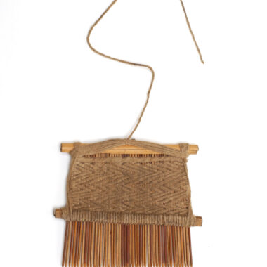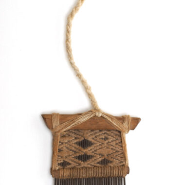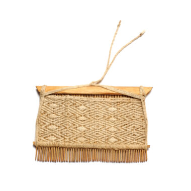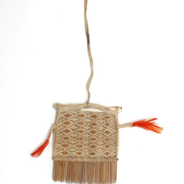 Objeto provido de um cordão de fio de algodão e composto por costelas de palmeira unidas entre si por meio de uma trança de fio de algodão e pequenas varetas de madeira. Peça confeccionada por homens e utilizada por ambos os sexos: 1) como pente; 2) mais raramente como um adorno pendurado dorsalmente no colar …