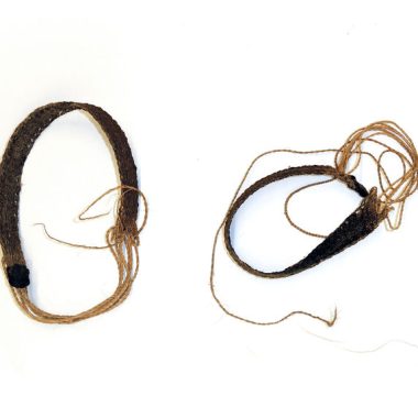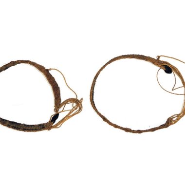 pulseiras – par – formadas por dentes montados em cordão de fibras vegetais tingidas com urucu