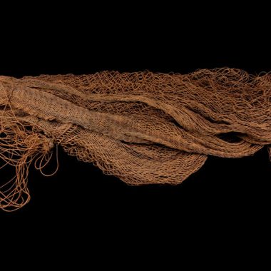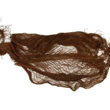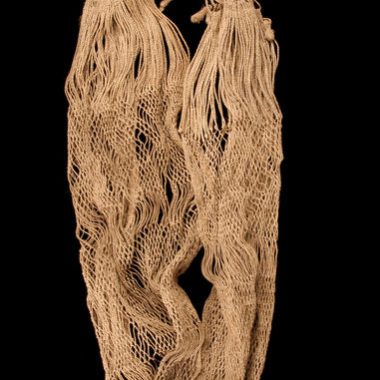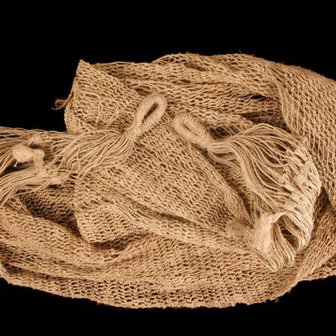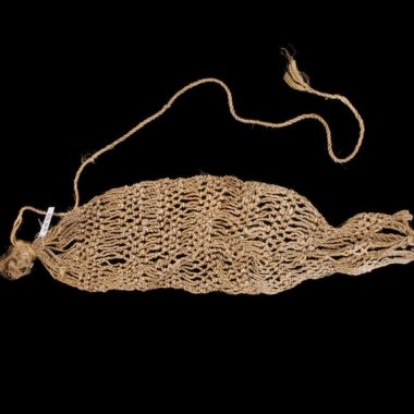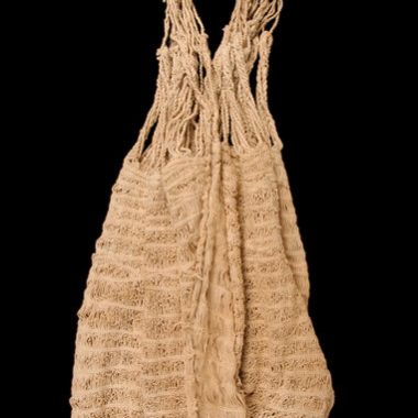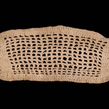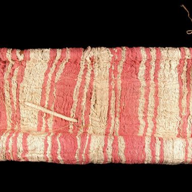 Feito de algodão gottamo. Peça inacabada. No processo de tecelagem. Constituindo um tear vertical. Sobre a madeira de montagem. O tecido tem 10 cm de largura e é projetado em cinco faixas paralelas, alternando iappaka branco e ic’agoni vermelho.