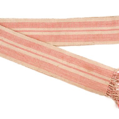 Feito de algodão gottama trançado. Uma fina faixa mediana é enquadrada por uma série de faixas largas e estreitas alternadas, rosa, preto, branco, rosa. Franjas torcidas de lewekra com pompons grandes. Altura 7 cm. Comprimento (sem franjas)