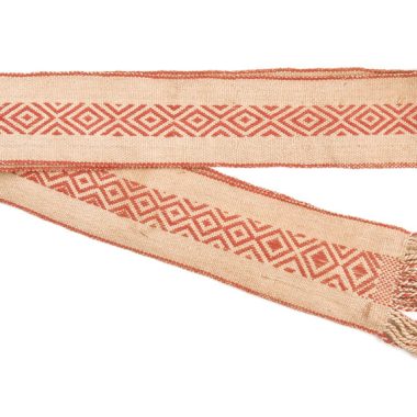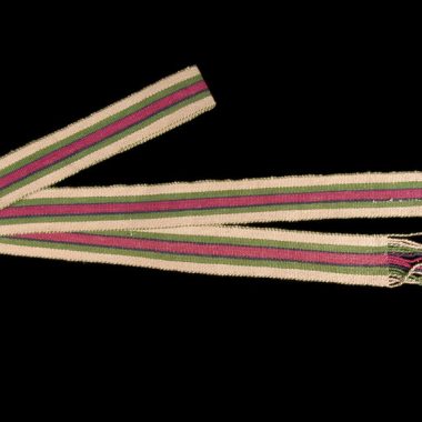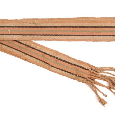 O cinto é feito de uma tira de tecido de algodão espesso e amarelado que parece ter sido cortado de crochê, 52 cm de comprimento e 1 cm de largura. Um lado da correia é coberto com tufos de marrom para baixo, exceto no lado esquerdo, a 11 cm. da extremidade, que é coberto com …